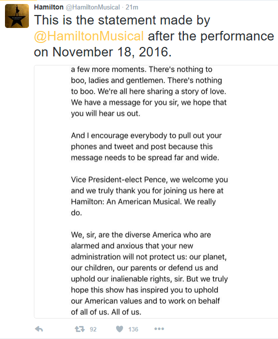 “Vice President-elect Pence, we welcome you and we truly thank you for joining us here at ‘Hamilton: An American Musical’ — we really do. We sir — we — are the diverse America who are alarmed and anxious that your new administration will not protect us, our planet, our children, our parents, or defend us and uphold our inalienable rights, sir. But we truly hope that this show has inspired you to uphold our American values, and to work on behalf of all of us. All of us. Again, we truly thank you for sharing in this show, this wonderful American story told by a diverse group of men and women of different colors, creeds and orientations.”