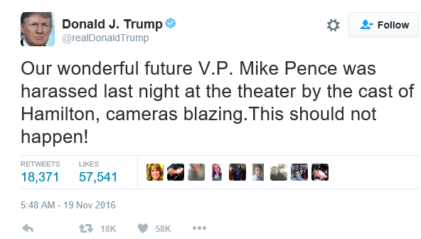 “Vice President-elect Pence, we welcome you and we truly thank you for joining us here at ‘Hamilton: An American Musical’ — we really do. We sir — we — are the diverse America who are alarmed and anxious that your new administration will not protect us, our planet, our children, our parents, or defend us and uphold our inalienable rights, sir. But we truly hope that this show has inspired you to uphold our American values, and to work on behalf of all of us. All of us. Again, we truly thank you for sharing in this show, this wonderful American story told by a diverse group of men and women of different colors, creeds and orientations.”