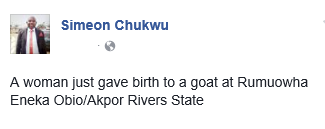 According to Facebook user, Simeon Chukwu, a woman who had been pregnant for 3 years allegedly got delivered of a goat at Karaka Community Hall in Rumuowha Eneka area of Port Harcourt, Rivers State recently. Read what he wrote and more photos after the cut…