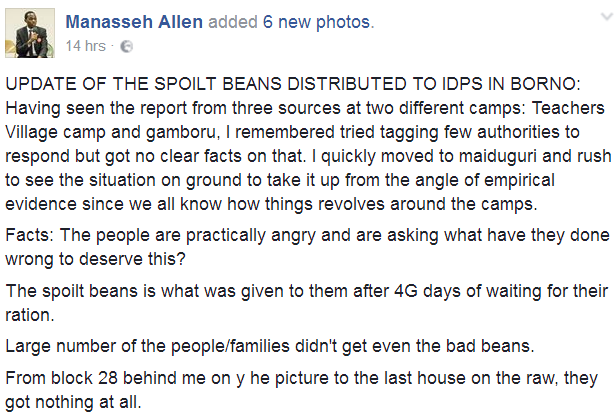 Facebook user, Yaga Allen claims that some IDPs at Teachers Village IDP camp in Borno state, were given these spoilt beans to cook and eat yesterday. According to him, the IDPs were given the spoilt beans on Wednesday and Thursday. Corroborating this claim is Chibok leader and spokesperson, Manasseh Alleh, who visited the camp and shared photos of the IDPs with the rotten beans.
