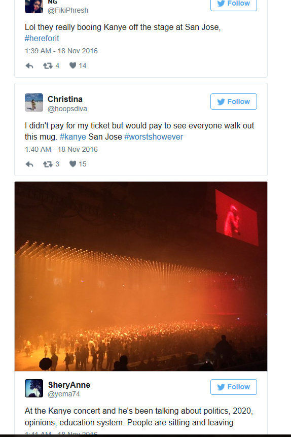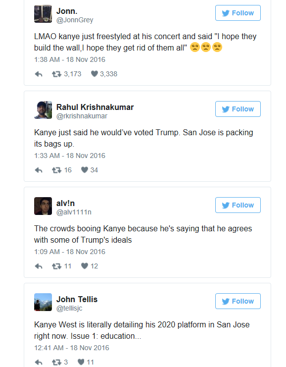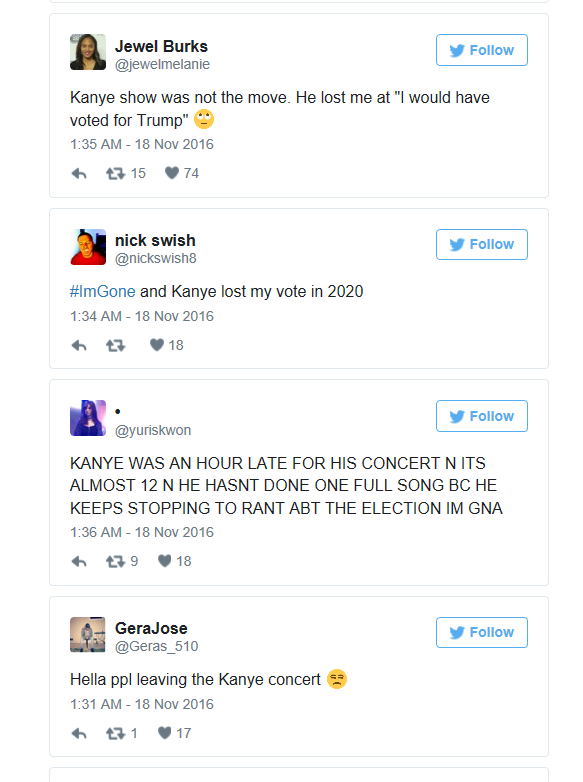On Thursday night, rapper, Kanye West arrived an hour late to his San Jose concert. Instead of jumping straight into his set list, he started to rant about this year’s US presidential election. He said: