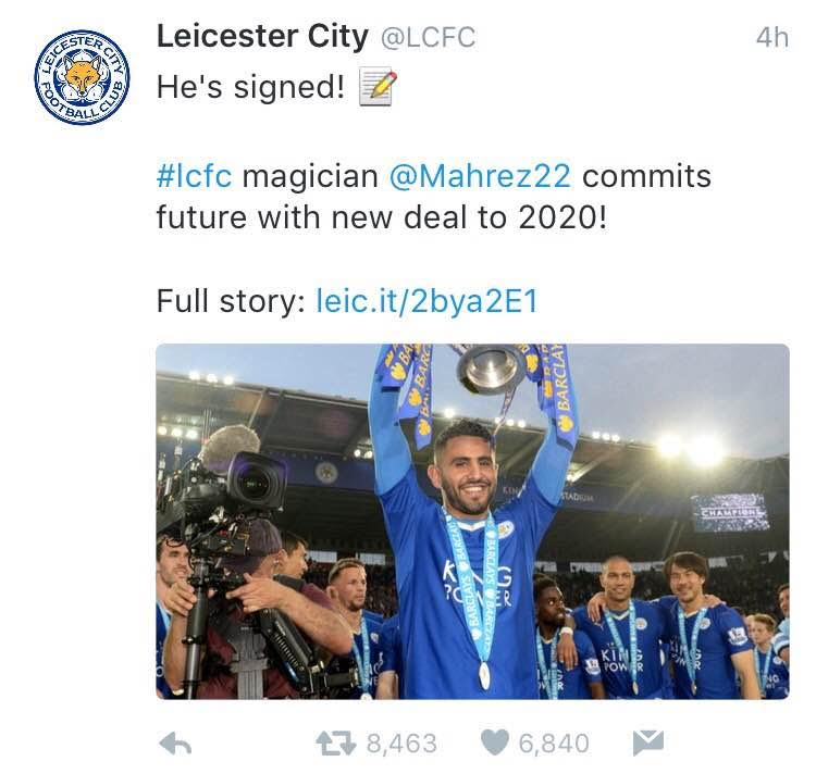 “Leicester City Football Club is delighted to announce that Riyad Mahrez has signed a new contract, committing his future to the Foxes until June, 2020,” the club’s statement released late on Wednesday night reads.