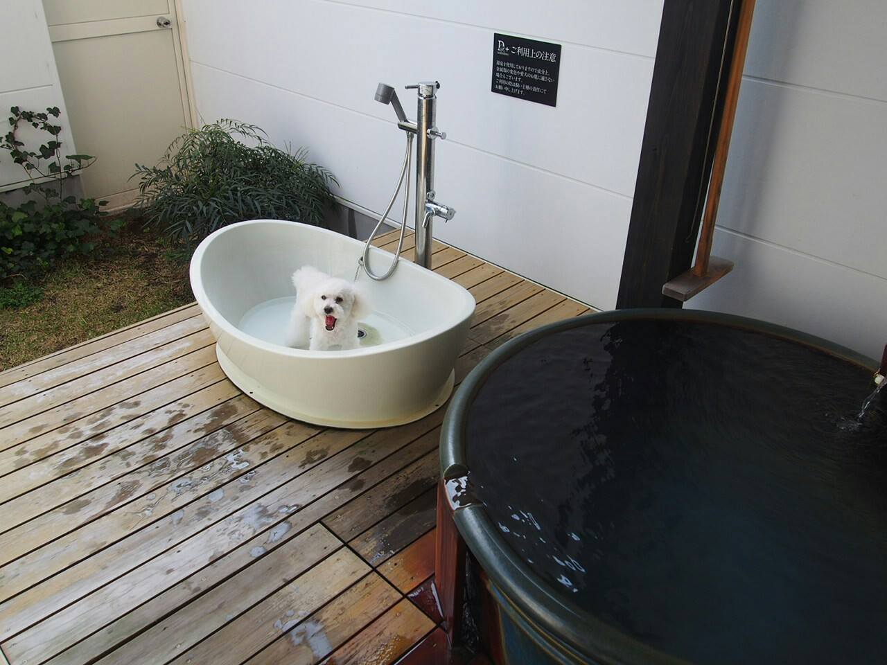 Humans and their their pets can relax in a mineral-rich bath and if the dogs want some ‘alone time’ away from humans, there’s a private swimming pool just for that purpose.