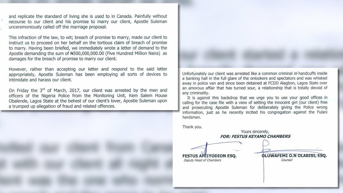 After her arrest, Stephanie filed a lawsuit against Apostle Suleman demanding to be paid N500million as damages for not honoring his promise to marry her and for harassment and threat to her life.