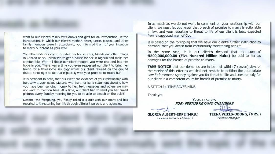 Controversial founder of Omega Fire Ministries, Apostle Johnson Suleiman, is currently enmeshed in an adultery scandal as a Canadian based Nigerian woman, Stephanie Otobo, has filed a N500 million lawsuit against him for allegedly getting her pregnant and dumping her. This is according to a letter sent to the IG of police by Festus Keyamo chambers on behalf of Stephanie