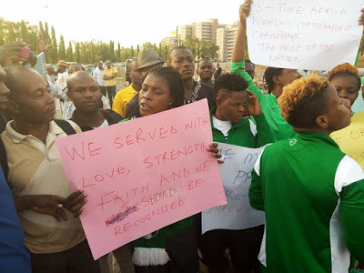 Super Falcons are currently staging a protest in front of the National Assembly over their unpaid allowances. They have been at loggerheads with NFF and the Ministry of Sports over their unpaid allowances after they won the African Women Cup of Nations some weeks ago. See more pics after the cut…