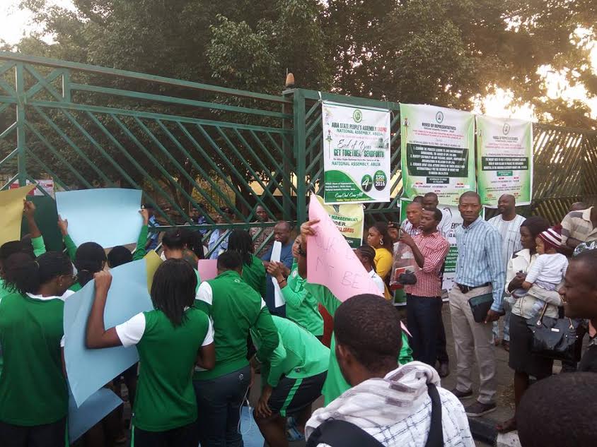 Super Falcons are currently staging a protest in front of the National Assembly over their unpaid allowances. They have been at loggerheads with NFF and the Ministry of Sports over their unpaid allowances after they won the African Women Cup of Nations some weeks ago. See more pics after the cut…