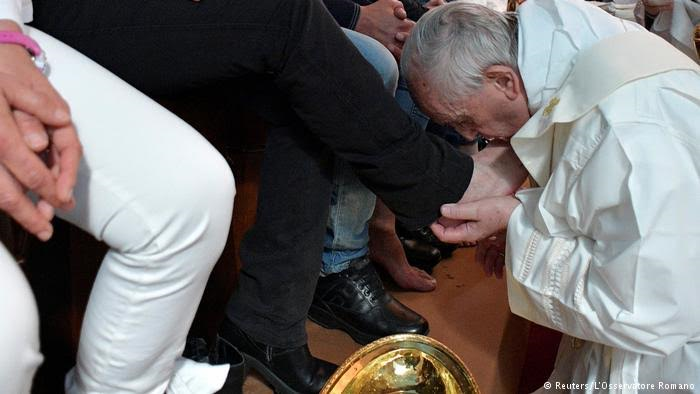 Pope celebrates ‘Holy Thursday in prison, washes the feet of 12 prison inmates (Photos)