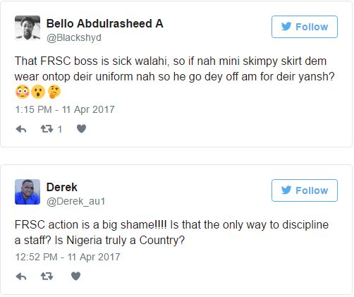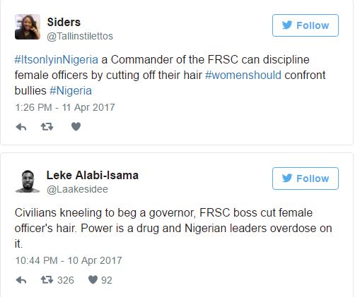 Following the viral photos of FRSC sector commander in Rivers state, Andrew A.Kumapayi, cutting off the hair extensions of some female members during their parade yesterday. Nigerians on Social media have come out to criticize the commander who is currently being questioned. See their comments after the cut…