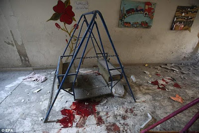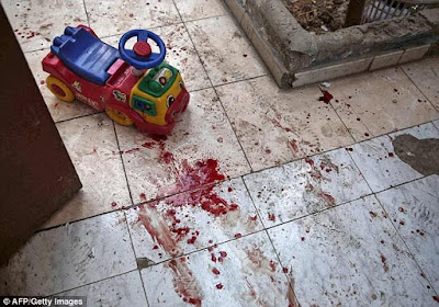 Photos from the scene show the environment splattered with blood. The young children rescued where covered in blood and their toys left strewn across the floor.