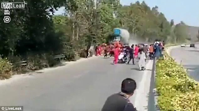 Two people were killed and three injured when an oil tanker lost control and ploughed into villagers who were celebrating their ancestors with a parade in Guangdong, China on February 13th. The villagers who were from nearby Meizhou were by one side of the road, dancing to the beat of a drum when the large vehicle began heading straight for the people.