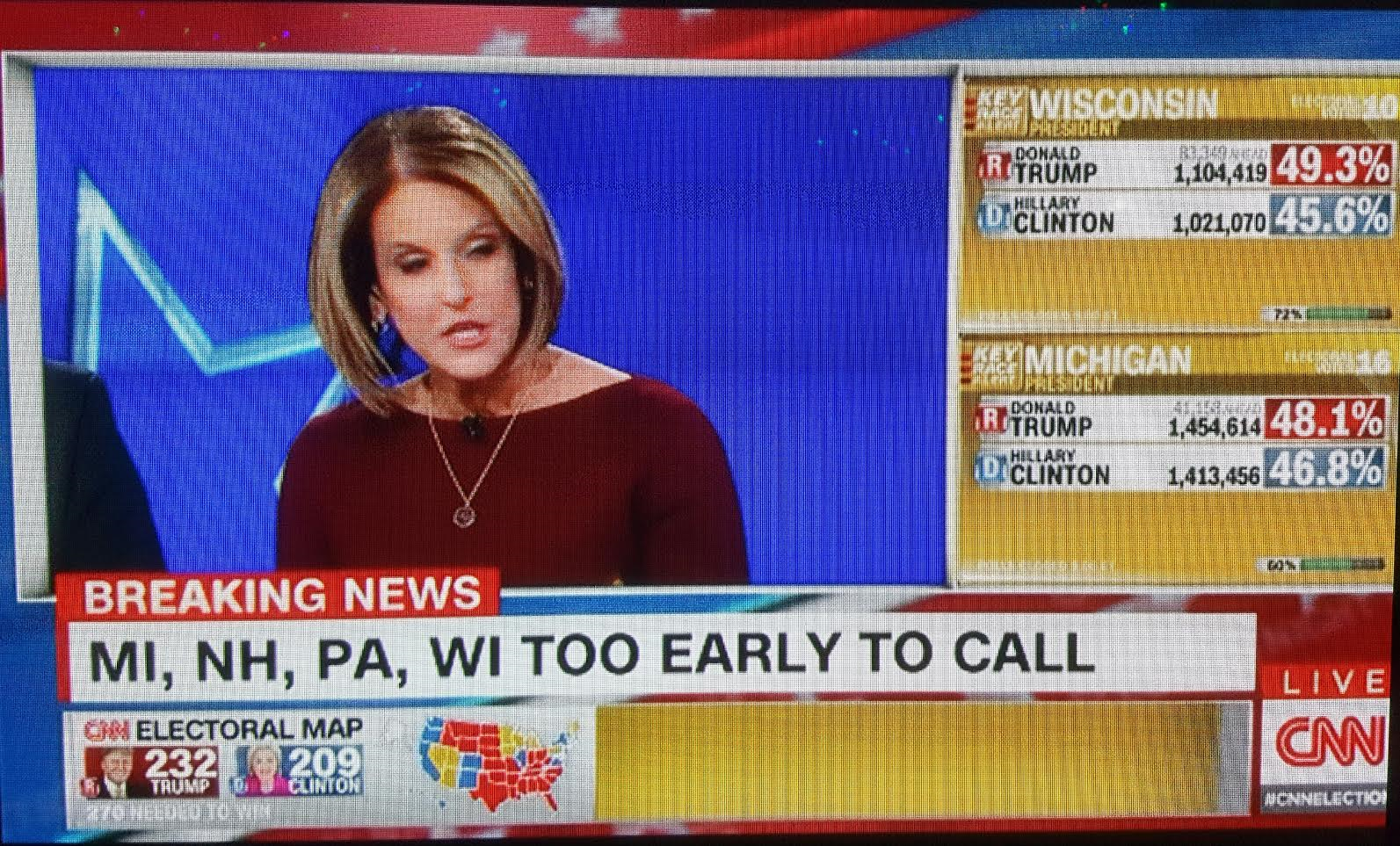 Hillary Clinton and Donald Trump are going to make history if either of them win the election. So far according to CNN, Donald Trump is winning with 245 electoral votes to Hillary’s 209 votes. Each candidate needs 270 electoral votes to win the US presidency. Fox News says Trump is winning by 254 electoral votes but the fight is still not over. Photos after the cut..