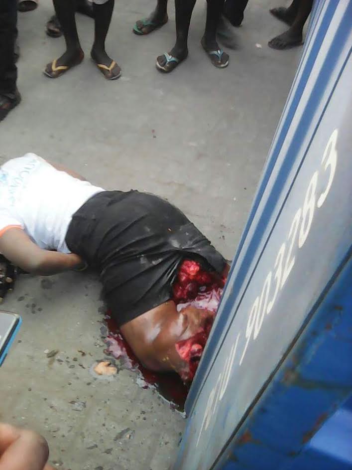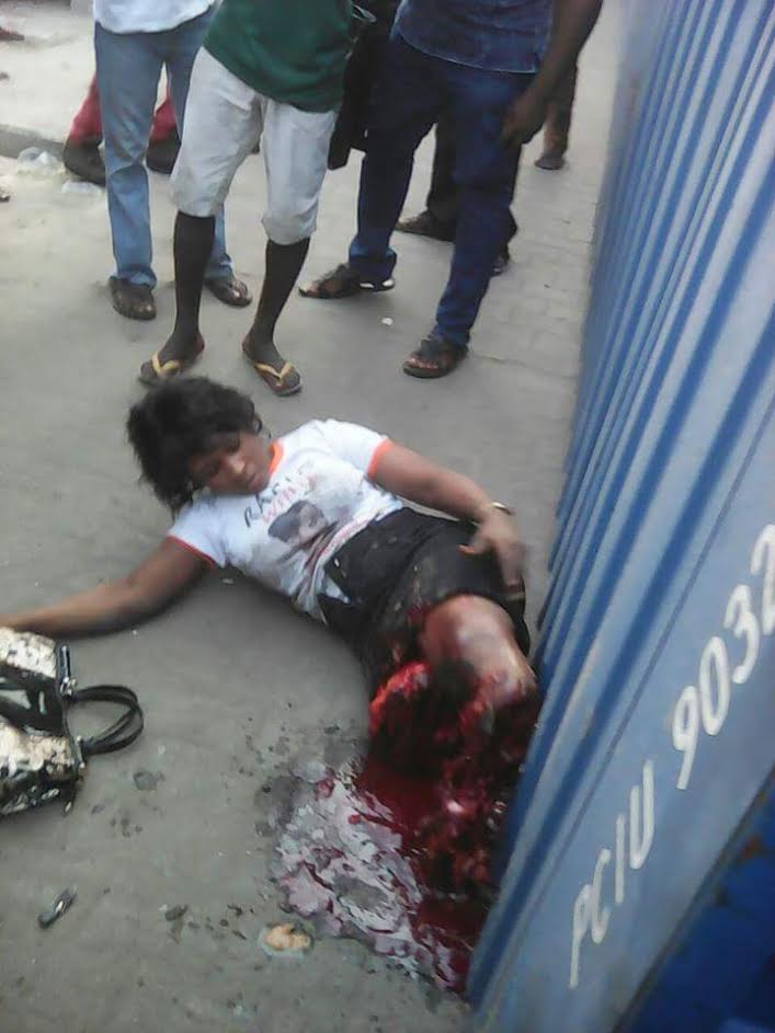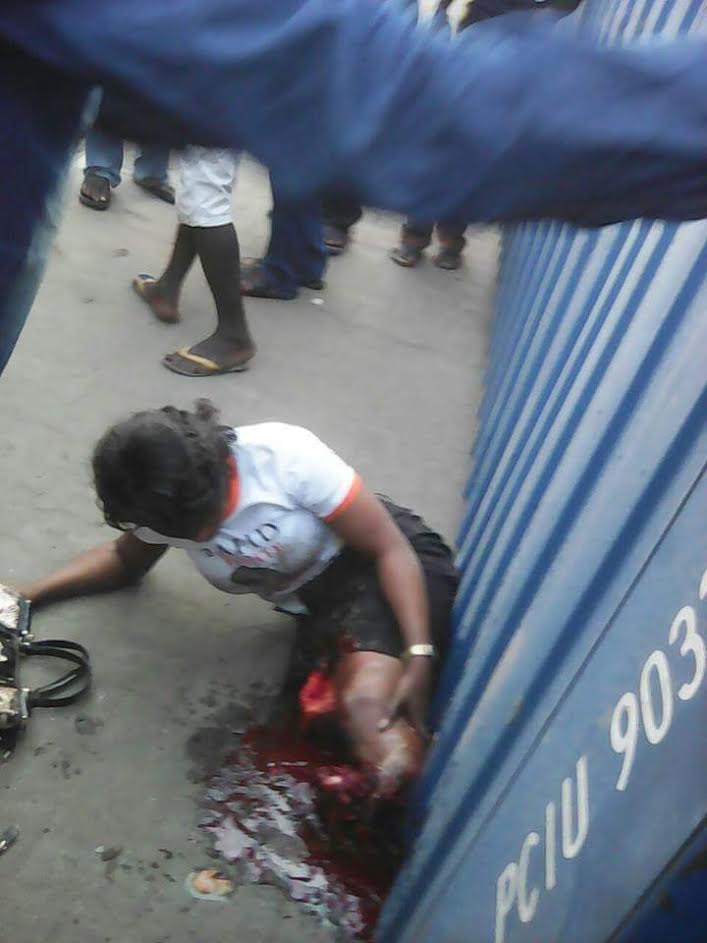 The horrific incident happened last Saturday morning at Mile 2 Junction, Lagos. There was an earlier report that the young woman’s legs were crushed when a container fell on her as she was about to board a motorcycle. People came to her rescue but couldn’t lift the container as it had heavy load inside. They reportedly cut off both legs and rushed her to the hospital. We initially heard she died on her way to the hospital but a doctor at LUTH told LIB that the lady is not dead but in ICU at LUTH. This we can’t confirm. See photos from the horrific accident after the cut…