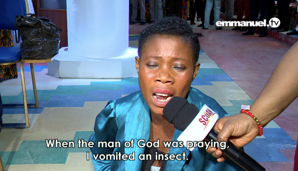 True to its reputation for releasing ‘spiritually sensational’ clips, Emmanuel TV’s YouTube channel has unveiled yet another video purportedly showing a Nigerian woman vomiting a live insect during a prayer session. The clip opens with T.B. Joshua leading congregants in a time of prayer before focusing on Miss Vivian Sunday who clutches her stomach next to a putrid pile of vomit.