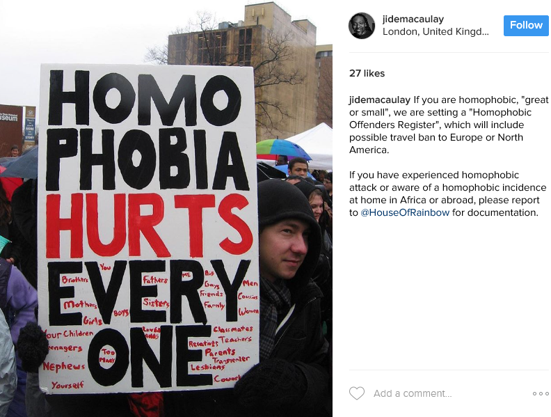 ‘If you are homophobic, ‘great or small’, we are setting a “Homophobic Offenders Register”, which will include a possible travel ban to Europe or North America. If you have experienced homophobic attack or aware of a homophobic incidence at home in Africa or abroad, please report to @HouseOfRainbow for documentation.’