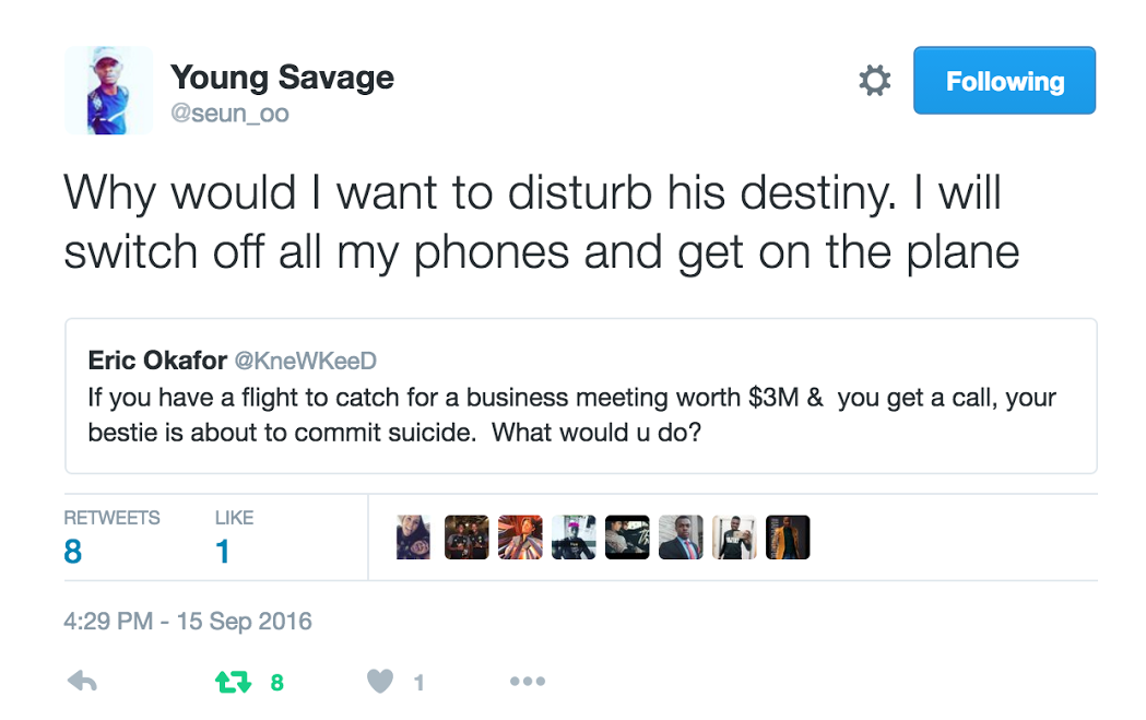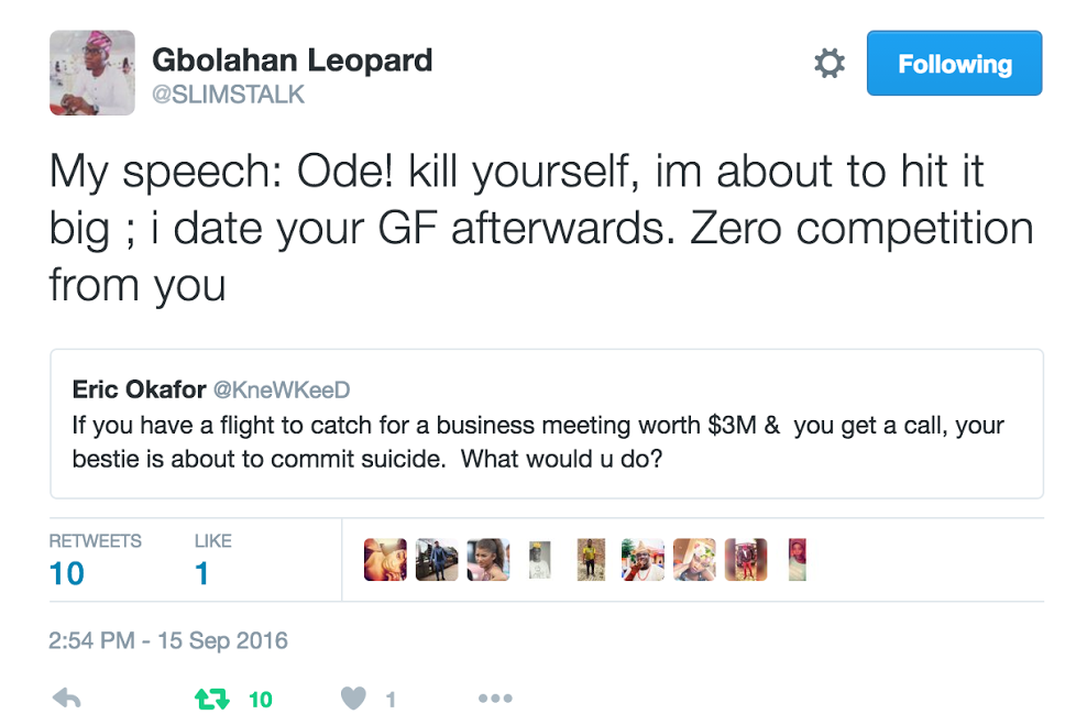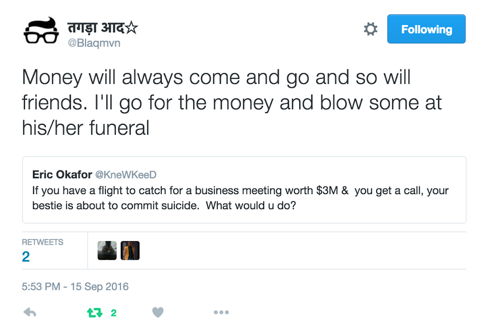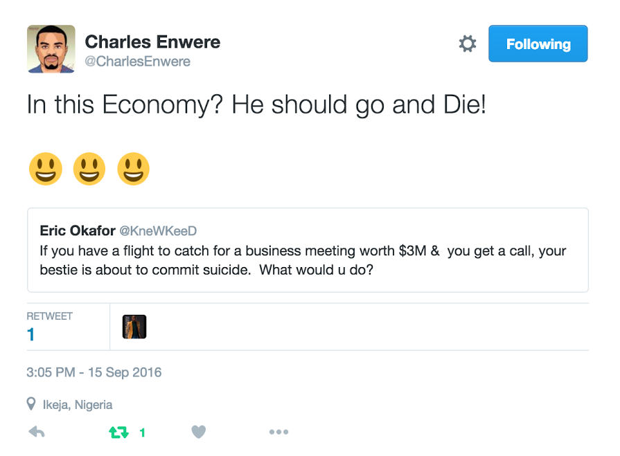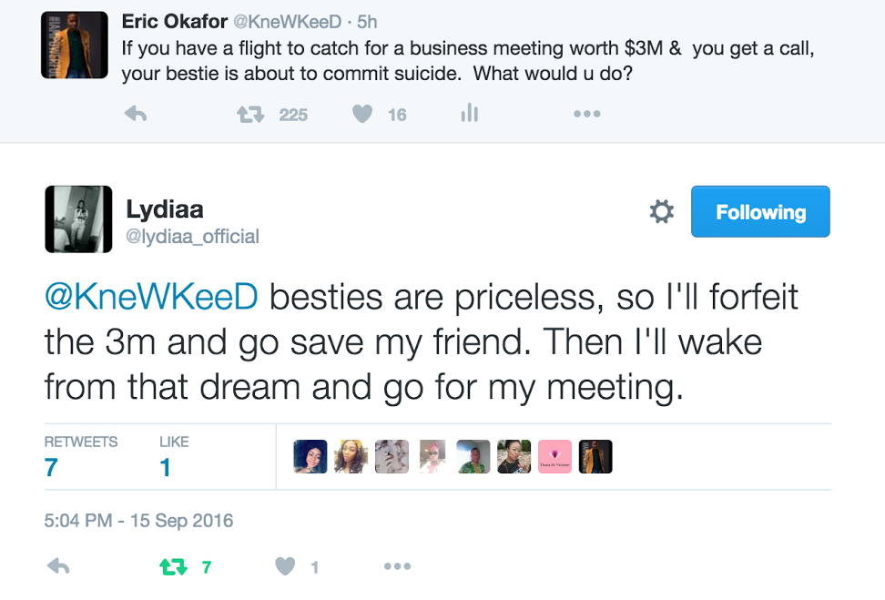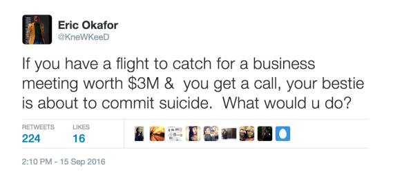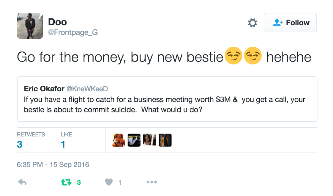 Gists‘Your bestfriend’s life or $3million?’ – Check out hilarious responses from Nigerians Last updated: September 16, 2016 6:22 am Oladimeji Olaoluwa Share 0 Min Read SHARE Popular twitter influencer Eric Okafor posted this hypothetical question on Twitter and the responses are incredibly hilarious. Read after the cut… Share This Article Facebook Copy Link Print ByOladimeji OlaoluwaFollow: Jeje is the CEO jejeupdates.com.. His passion for movies and news led to the creation of this website.. You can reach him anytime via whatssapp on +2348118596162 for advert, enquiries.. Leave a CommentLeave a Reply Cancel replyYour email address will not be published. Required fields are marked *Comment *Name * Email * Website ΔStay Connected235.3kFollowersLike69.1kFollowersFollow11.6kFollowersPin56.4kFollowersFollow136kSubscribersSubscribe4.4kFollowersFollow - Advertisement -Latest News Nollywood Movie – Queen Lateefah Movies movies Nollywood November 11, 2025 Akudaaya – Nollywood Yoruba Movie Movies Nollywood November 11, 2025 Music: Boyspyce ft Jeriq – Achalugo Music November 11, 2025 Music: Ty Bello ft Bbo ft Pelumi Deborah – Alagbara Music October 30, 2025