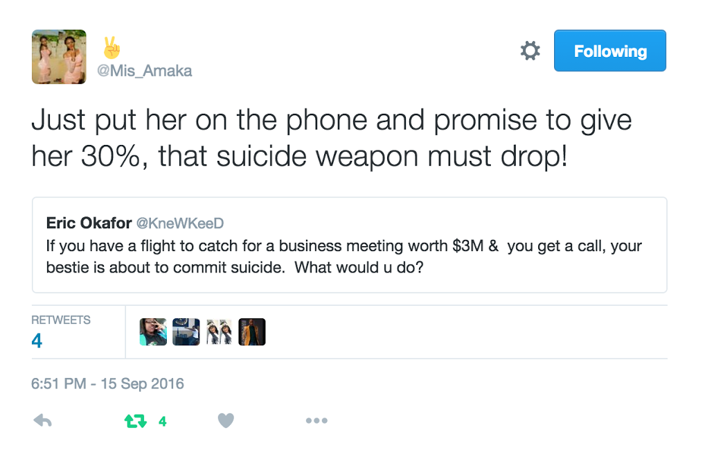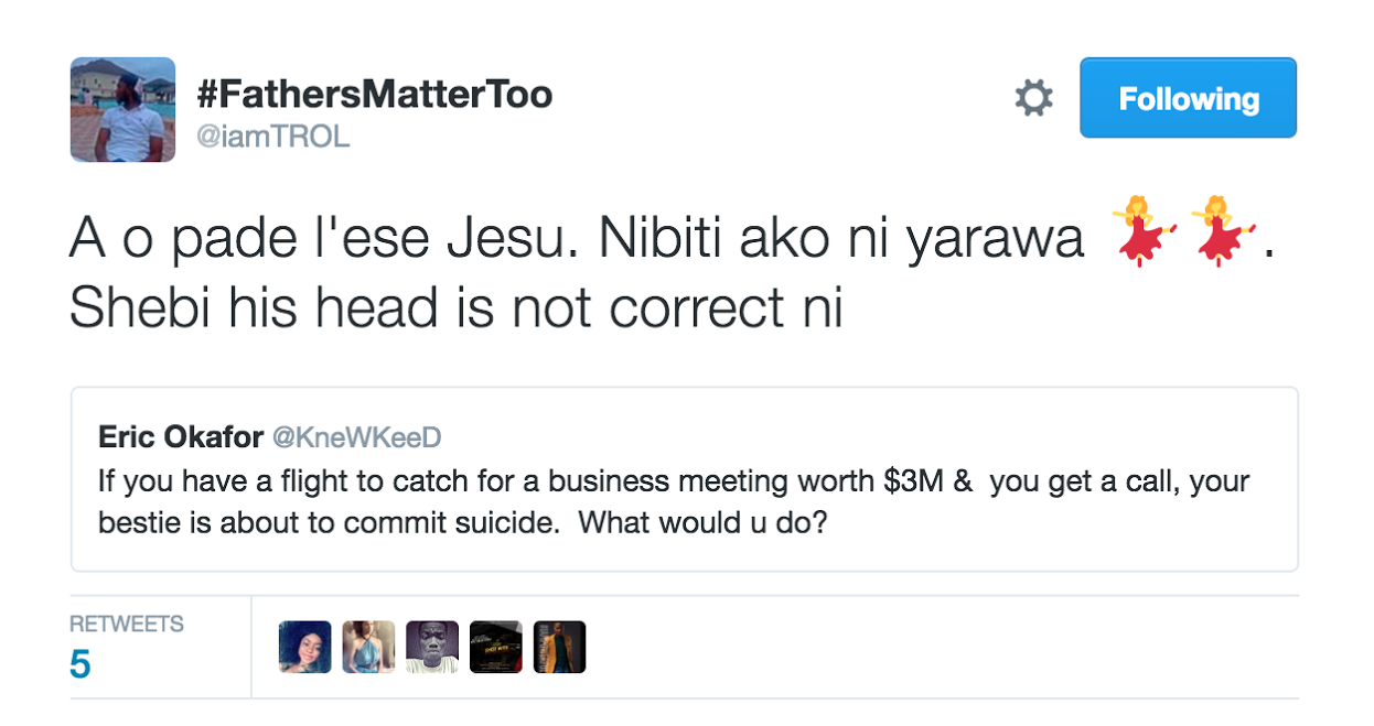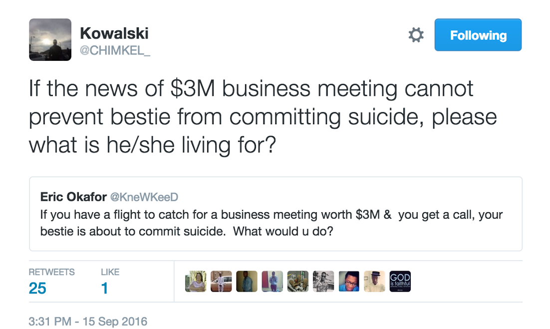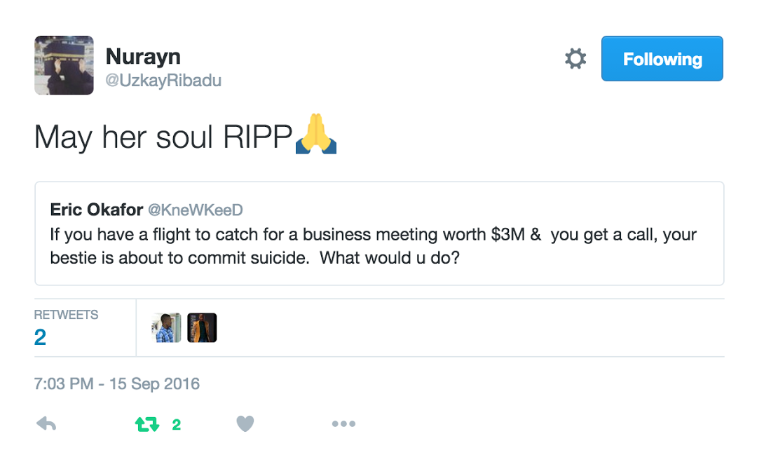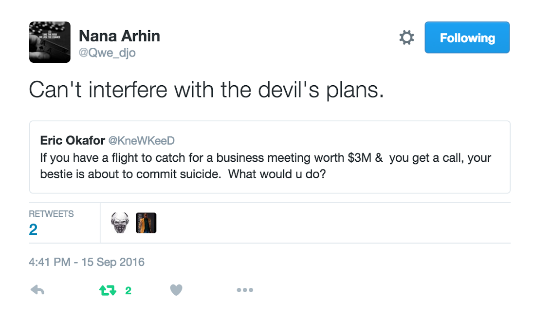 Gists‘Your bestfriend’s life or $3million?’ – Check out hilarious responses from Nigerians Last updated: September 16, 2016 6:22 am Oladimeji Olaoluwa Share 0 Min Read SHARE Popular twitter influencer Eric Okafor posted this hypothetical question on Twitter and the responses are incredibly hilarious. Read after the cut… Share This Article Facebook Copy Link Print ByOladimeji OlaoluwaFollow: Jeje is the CEO jejeupdates.com.. His passion for movies and news led to the creation of this website.. You can reach him anytime via whatssapp on +2348118596162 for advert, enquiries.. Leave a CommentLeave a Reply Cancel replyYour email address will not be published. Required fields are marked *Comment *Name * Email * Website ΔStay Connected235.3kFollowersLike69.1kFollowersFollow11.6kFollowersPin56.4kFollowersFollow136kSubscribersSubscribe4.4kFollowersFollow - Advertisement -Latest News Nollywood Movie – Queen Lateefah Movies movies Nollywood November 11, 2025 Akudaaya – Nollywood Yoruba Movie Movies Nollywood November 11, 2025 Music: Boyspyce ft Jeriq – Achalugo Music November 11, 2025 Music: Ty Bello ft Bbo ft Pelumi Deborah – Alagbara Music October 30, 2025